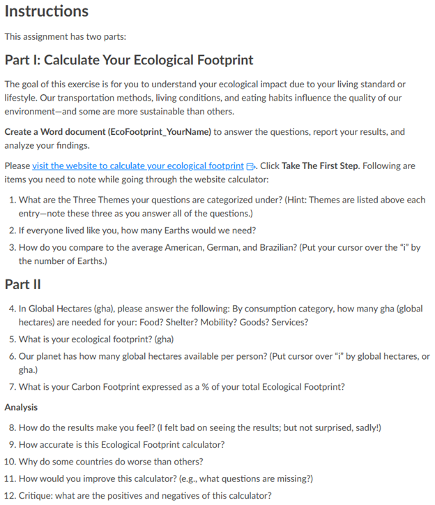By entering real data about their daily routines and consumption habits into the ecological footprint calculator, students connect abstract course concepts to their own lives. The results often prompt reflection not only on individual behaviors but also on broader societal patterns. In addition to analyzing their outcomes, students are encouraged to think critically about the tool itself by examining its accuracy and limitations.