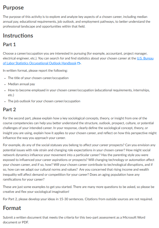 Finally, students submit their work as a two-part written assignment: career research and sociological analysis.