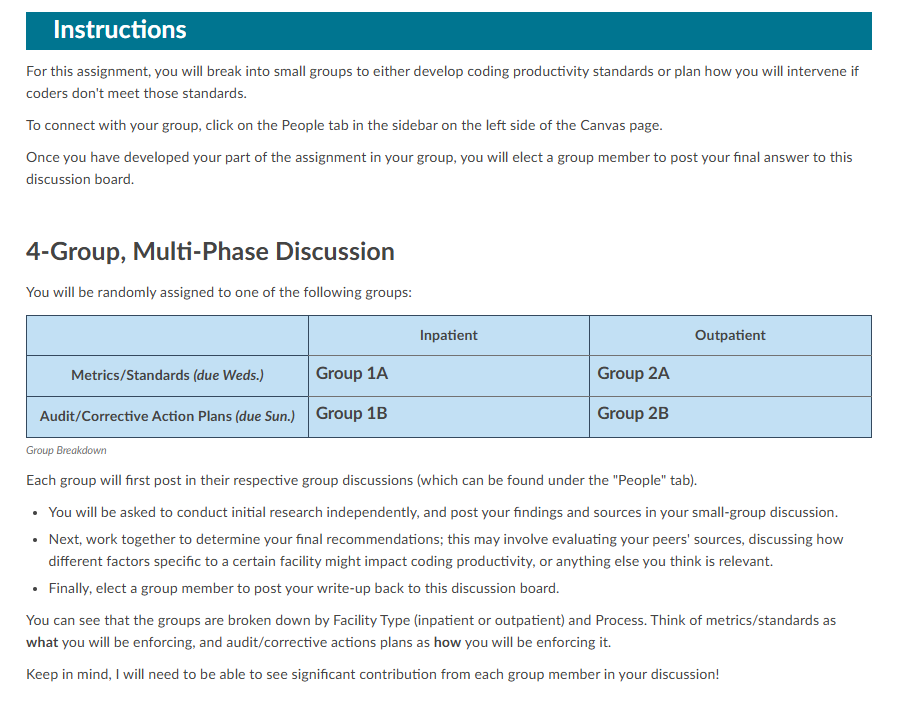 Students are divided into four groups, each with a specific task. Two groups (A groups) develop productivity standards for medical coding—one focused on inpatient settings and the other on outpatient settings. The other two groups (B groups) create audit and corrective action plans for coders who do not meet the standards developed by the A groups.